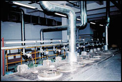 本联合机采用间接纺,切片经挤压、过滤、计量、喷丝、环吹冷却、上油、牵引、喂入将丝束整齐铺排于盛丝筒内。本机和短纤维后加工设备配套生产1.56~16.5dtex涤纶短纤维,用于与棉、粘胶、毛混纺以及生产三维中空涤纶短纤维。   本机由BHV453型纺丝机、BHV473型卷绕机和BHV484型盛丝桶往复装置组成,电机控制采用DCS集散式控制系统或二次智能仪表控制。 技术规格: 项目 单位 数据 BLHV436—24 BLHV--12 成品丝纤度 dtex 1.56~16.5 年生产能力 t 15000 7500 纺丝位数 24 12 纺丝位距 mm 650 纺丝速度 m/min 800~1300 螺杆直径 mm φ150(φ120)×4 φ150(φ120)×2 纺丝箱数 4(6位/箱) 2(6位/箱) 纺丝箱节距 mm 1200 计量泵规格 ml/r 70 喷丝板最多孔数 2592(φ328mm×22mm) 冷却装置 半敞开环吹风 上油装置 双面油轮上油,φ150mm油轮 牵引纤度 dtex 38×100000 19×100000 牵引喂入机 mm 七辊、五棍牵引、齿形喂入辊 φ240×310、φ480×125、φ480×165 盛丝桶纵向速度 m/min 3~10 盛丝桶横向速度 m/min 0.5~2.5 全机额定功率 kw 180 107。